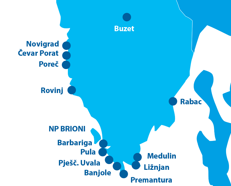 Nejseverněji položená oblast Chorvatska s jaderským pobřežím tvoří trojúhelník v moři, od Umagu na severovýchodě po Rijeku na severozápadě istrijského poloostrova. Istrie se může chlubit mnoha cennými uměleckými i historickými památkami, od dob ilyrských, přes období ranného křesťanství, po antiku, období středověku i novověku. Pobřeží je z velké části vápencové a krasové, mnohde lemované překrásnými přírodními skalními útvary s jeskyněmi, oblázkovými plážemi, s průzračnou vodou nasycenou minerály. Istrie je v Čechách velmi oblíbená. Díky krátké vzdálenosti z ČR je možné dojet na místo za 8 - 12 hodin.