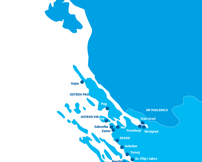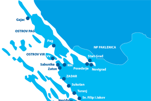 Rozsáhlá oblast od písečného Zatonu přes velkolepý Zadar po Primošten zahrnuje ostrovy Pag, Vir, Murter, Vrgada, Pašman, Ugljan, Kornati aj. Oblast je proslavena 4 národními parky - Plitvice, Kornati, Paklenica a Krka. Nenechte si ujít návštěvu královských měst Zadar, Biograd na Moru a Nin. Menší letoviska od Zadaru po Biograd na Moru tvoří oblast komorních letovisek, s modrými vlajkami za čistotu moře a pláží. Malebná, pro Čechy dosud neznámá Tribunj je idilyckým místem k trávení dovolené, doporučujeme vaší pozornosti. Zveme vás k návštěvě Primoštenu, z jehož kouzelného starobylého centra s rušným společenským životem na malém ostrůvku je všude blízko. Severní Dalmácie je kulturně i historicky atraktivní oblastí, kde se snoubí kvalita služeb se spektrem výletů, sportovních i kulturních aktivit. Nezapomeňte na půvabné městečko Vrbnik, zde se rodí kvalitní bílé odrůdové víno Vrbnička Žlahtina.