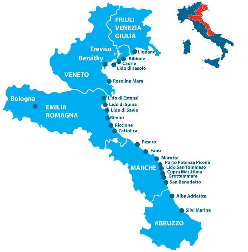 Tento italský kraj někdejší Benátské republiky se rozkládá od Pádské nížiny až po Dolomity. Jeho západní hranici tvoří největší italské jezero Lago di Garda, na východě jej ohraničuje Jaderské moře. Na členitost pobřeží má velký vliv především benátská laguna s mnoha krásnými plážemi. Centrem oblasti jsou světoznámé Benátky, jedinečné město vybudované na ostrůvcích ve vodách Jaderského moře. K návštěvě zvou i další starobylá města, k nimž patří Verona, Vicenza a Padova.
