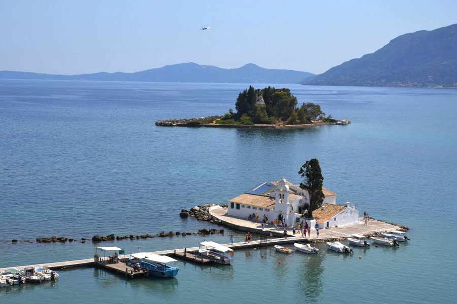 Asi nejznámější ostrůvek Korfu. Tento malý zelený ostrov je podle pověsti Odysseovou lodí, kterou nechal zkamenět bůh Poseidon. Uprostřed ostrova je v zeleni schovaný kostelík z 11. století. Nedaleko Myšího ostrova se rozkládá po celé ploše dalšího malého ostrůvku ženský klášter Pangía Vlachérna ze 17. století. Je přístupný a s pevninou ho spojuje molo.