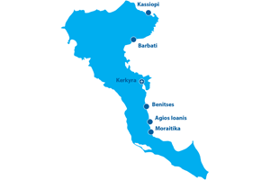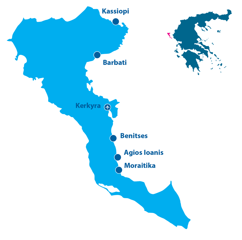Korfu, nazývaný také "Smaragdovým ostrovem", plní všechny sny o pohádkové dovolené, a tak není divu, že kdo sem jednou zavítá, neodolá, aby se nevrátil. Letoviska Korfu jsou rozprostřena téměř po celém pobřeží, a tak si tu každý najde přesně to, co od své dovolené u moře očekává. Najdete tu rušná střediska s perfektními hotely a prvotřídními službami, ale také místa, na kterých se člověk může nerušeně těšit z blahodárného klidu a krásné přírody kolem.