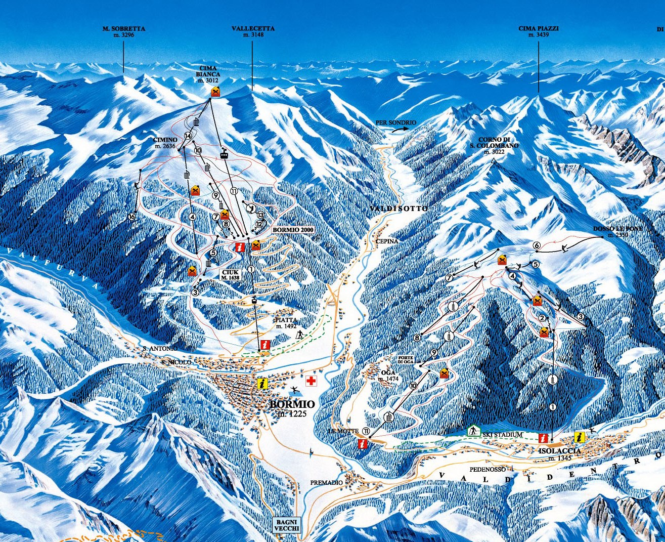 Nejdelší sjezdovku v oblasti Bormio najdete na Cima Bianca (3012 m n.m.), je střední obtížnosti, dlouhá 10 km a má převýšení 1780 m. Nejtěžší sjezdovka Betulle je naopak dlouhá "jen" 1,4 km a překonává výškový rozdíl 400 m. Milovníkům obřích carvingových oblouků udělá radost závodní trať Bimbi al Sole. Pokud si libujete v lyžování za umělého osvětlení, čeká na vás pětikilometrová sjezdovka Stelvio střední obtížnosti s převýšením 300 m. Snowboard Snowpark najdou vyznavači tohoto sportu u střední stanice lanovky Bormio 2000.
