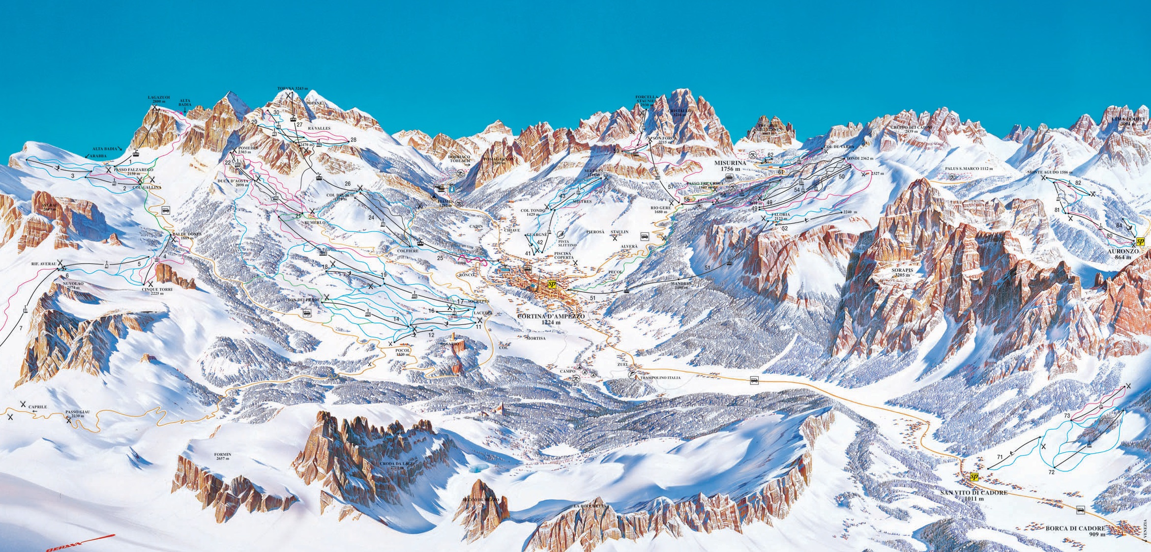 Od olympijského stadiónu vyjíždí visutá kabina do kotliny Ra Vallés, v níž se pod vrcholem Tofany (3246 m.n.m.) lyžuje ve výškách 2340 - 2830 m.n.m.. Ještě výš leží areál Cristallo, odkud z Forcella Staunies (2930 m.n.m.) padá "superčerná" trať k průsmyku Tre Croci. Jednu z nejúchvatnějších vyhlídek v Dolomitech si užijete, když vyrazíte skibusem na průsmyk Passo Falzarego (2105 m.n.m.) a odtud lanovkou na vrchol Lagazuoi ve výšce 2750 m.n.m..