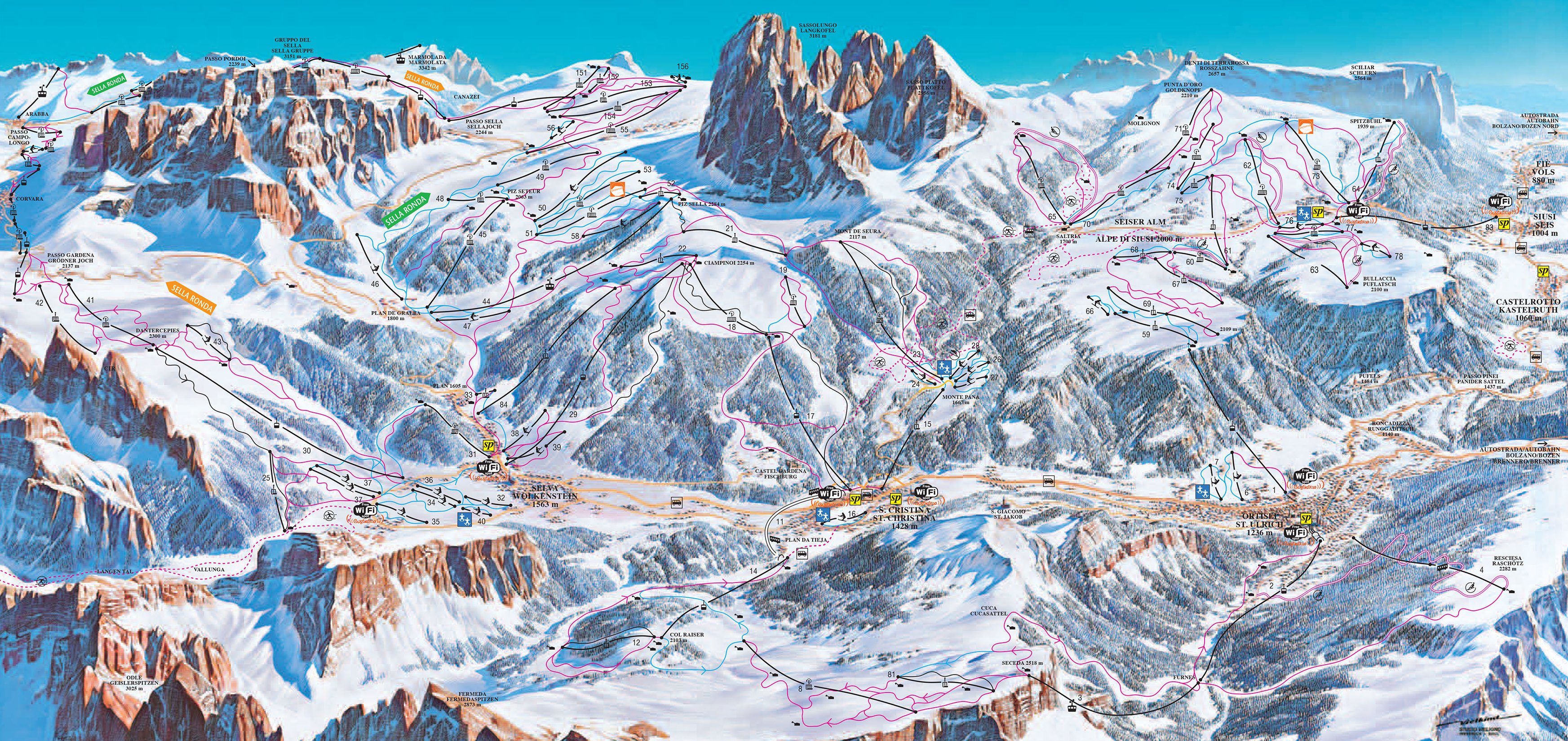 Val Gardena má 4 části: St. Ulrich - Ortisei, Santa Cristina, Selva-Wolkenstein a také Alpe di Suisi. Vesničku Selva přímo protínají sjezdové tratě okruhu Sella Ronda. Je zde ale i skvělá černá sjezdovka, která vede přímo z Ciampinoi (2254 m.n.m.) a končí téměř v centru Selva-Wolkenstein. Další možností nastoupit přímo na sjezdové tratě je St. Cristina. Vesnička je rozdělena na dva lyžařské areály propojené novou podzemní drahou, vůbec první v Dolomitech. Sjezdové tratě na svazích Monte Pana a Ciampinoi mají převážně charakter náročných černých sjezdovek. Jednou z nich je i známá ostrá trať padající ze samého vrcholu Ciampinoi až do St. Cristiny. Tady se na planině pod štítem Monte Severa (2518 m.n.m) otevírá další bohatá nabídka lyžování v podobě červených a modrých sjezdovek. Odtud je přímé napojení na St. Ulrich – Ortisei, který má také dvě části. První z nich je komplex pod Monte Severa odkud vede nádherná červená sjezdovka v podstatě do centra St. Ulrich. Na druhé straně St. Ulrichu začíná druhá část s kabinovou lanovkou, která vás vyveze na vrcholek hory Monte Piz (2109 m.n.m.). Tam už čeká lyžování na krásně upravených sjezdových tratích Alpe di Siusi, poslední části Val Gardeny. V této oblasti naleznete lyžování na převážně jednodušších červených a modrých tratích pro začátečníky, ale i lyžaře, kteří se rádi rozjezdí, než zamíří na černé padáky v samém srdci Val Gardeny – v Santa Cristině a v Selvě.