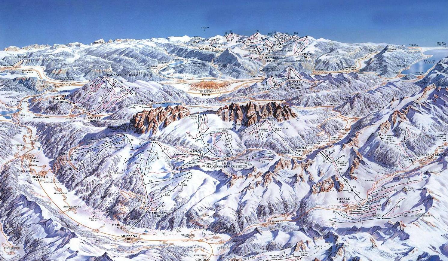 Tento nekonečně rozlehlý skiareál zahrnuje 6 samostatných lyžařských středisek: Passo Tonale, Ponte di Legno, Marilleva/ Folgarida, Madonna di Campiglio, Pinzolo a Pejo.