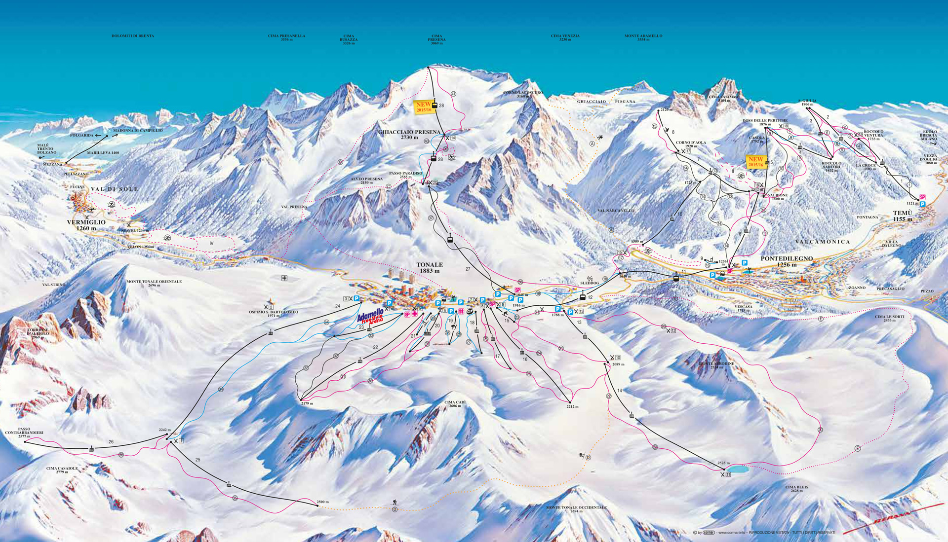 Ideální zimní dovolená v malebné alpské městečko Ponte di Legno (1257 m.n.m.)pod Passo Tonale. Severní svahy nad městečkem zčásti pokrývají lesy, díky tomu zde naleznou skvělé podmínky pro lyžování především náročnější lyžaři, kteří při sjezdu zdolávají úctyhodné převýšení téměř 900 metrů. Obě lyžařská střediska jsou propojena sjezdovou tratí Pegra, která Vás zaveze přímo k začátku nové sedačkové lanovky ze Sozzine k vrcholku Corno D´Aola. Nová kabinová lanovka Sozzine propojuje také Ponte di Legno a Passo Tonale, na druhou stranu vede sedačková lanovka do části Temú, kde se rozprostírají další sjezdové tratě o celkové délce zhruba 10 km.
